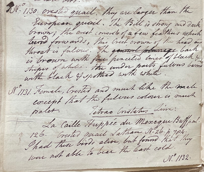 Charles Willson Peale (1741-1827) wrote, in his 30th Lecture (ca. 1799): "No. 1130. Crested Quail. They are larger than the European Quail. The bill is strong and dark brown; the crest consists of a few feathers which turn forwards. This crest, crown of the head, and throat is fulvus. The general plumage back is brown with fine penciled lines of black & stripes of white; the underparts fulvus, barred with black & spotted with white. No. 1131. Female, crested and much like the male except that the fulvus colour is much paler. Tetrao cristatus Linn. La Caille Huppée du Mexique Buff. pl. enl. 126. Crested Quail Latham No. 26. p. 784. I had these birds alive, but found that they were not able to bear the least cold." (Academy of Natural Sciences of Drexel University Archives, coll. 40)