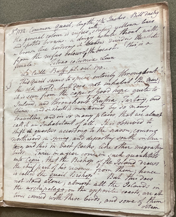 Charles Willson Peale (1741-1827) wrote, in his 30th Lecture (ca. 1799): "No. 1132. Common Quail. Length 7 ½ Inches. Bill dusky; the general colour is rufus, with striped yellow lines and spotted brown; a dingy white throat, with a brown line bordering it, diving the white from the rufus colours of the breast. This is a female. Tetrao coturnix Linn. La Caille. Buff. pl. enl. 170. This quail seems to spread entirely throughout the Old World, but does not inhabit the New; it is seen from the Cape of Good Hope quite to Iceland, and throughout Russia, Tartary, and China, and in short is mentioned by so many travelers, and in so many places, that we almost call it an Inhabitant of All. It is observed to shift quarters according to the season, coming northward in spring, and departing south in Autumn; and this in vast flocks, like other migratory birds. Twice in a year come in such quantities into Capri, that the Bishop of the Island draws the chief part of his [revenue] from them; hence [it] is called the Quail Bishop." (Academy of Natural Sciences of Drexel University Archives, coll. 40)