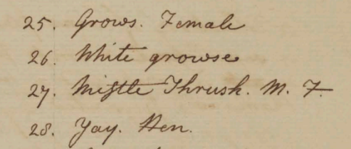 An undated list of 21 bird specimens in Charles Willson Peale's (1741-1827) handwriting includes an unidentified "Grouse" (American Philosophical Society Library, Mss.B.P31).