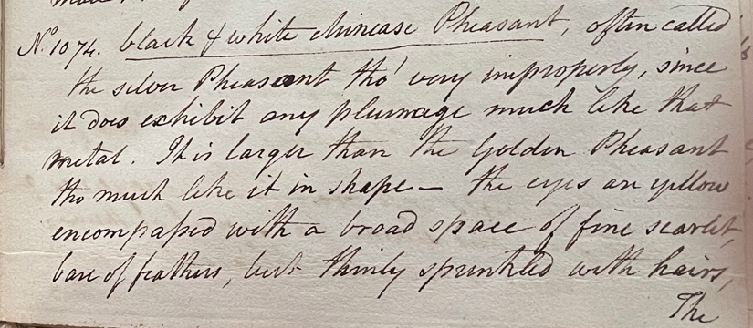 Charles Willson Peale (1741-1827) wrote, in his 29th Lecture (ca. 1799): "No. 1074. Black & white Chinease Pheasant, often called the Silver Pheasant, tho' very improperly, since it does [not] exhibit any plumage like that metal. It is larger than the Golden Pheasant, tho much like it in shape. The eyes are yellow encompassed with a broad space of fine scarlet, bare of feathers, but thinly sprinkled with hairs. The crest is black with purple gloss; the sides fo the neck, back, wings and tail are white, each feather having 3 or 4 fine black lines round their ends, except the great quils and the outer feathers of the tail, which are barred; from the front of the neck extending to all the under part of the body is black with a purple gloss; the feet are red, with spurs of a light colour." (Academy of Natural Sciences of Drexel University Archives, coll. 40)
