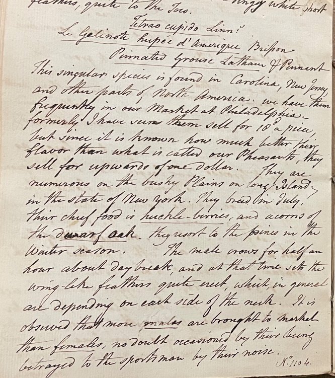 Peale continued: "They are numerous on the bushy plains of Long Island, in the state of New York. They breed in July. Their chief food is huckle-berries, and acorns of the dwarf oak. They resort to the pines in the winter season. The male crows for half an hour about daybreak, and at that time sets the wing-like feathers quite erect, which in general are depending on each side of the neck. It is observed that more males are brought to market than females, no doubt occasioned by their being betrayed to sportsmen by their noise. No. 1104. Female, is smaller than the male, less bright in colour, and wants the wing feathers on the neck. This specimen [has] not quite got its groath … No. 1107. Chickens of the Heath Cock which I got at Cape May in the month of May (1799). The hen had with her, according to the account I received from the man who gave them, more than one Doz. young ones." (ANSP Archives, coll. 40)