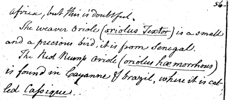 Charles Willson Peale (1741-1827) wrote, in "A Walk Through the Philad[elphi]a Museum" (1805–1806): "The weaver Oriole (oriolus Textor) is a small and a precious bird, it is from Senegal." (Historical Society of Pennsylvania, coll. 0481)