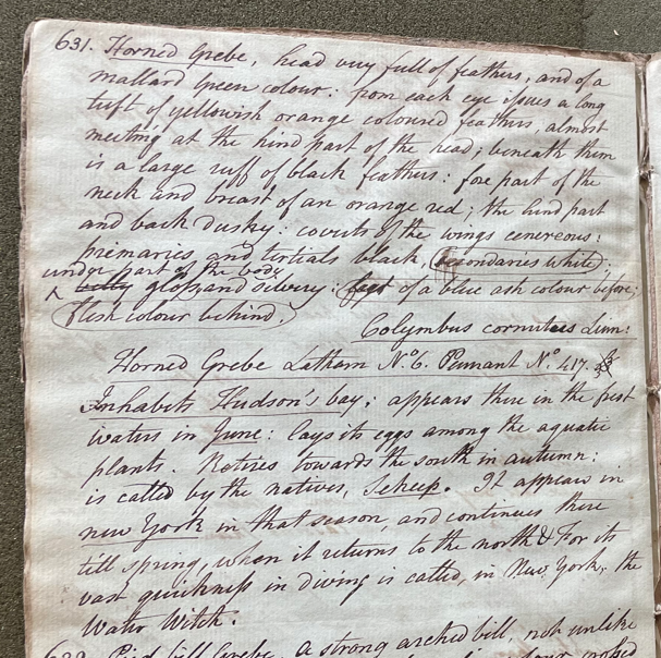 Peale wrote, in "A Walk Through the Philad[elphi]a Museum" (1805–1806): "one found here is much Smaller called the Horned Grebe (C. Cornutus) it is a rare bird in our Waters, but is said it stays at New York all the Winter." (Historical Society of Pennsylvania, coll. 0481)