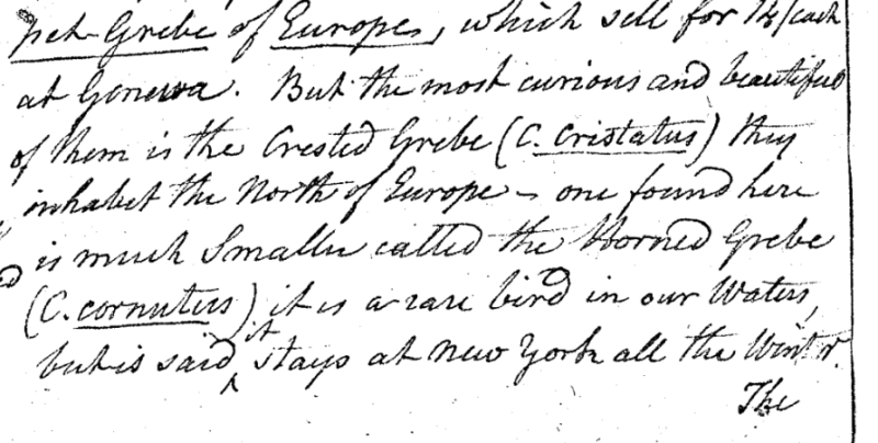Charles Willson Peale (1741-1827) wrote, in "A Walk Through the Philad[elphi]a Museum" (1805–1806): "But the most curious and beautiful of them is the Crested Grebe (C. Cristatus(). They inhabit the north of Europe." (Historical Society of Pennsylvania, coll. 0481)