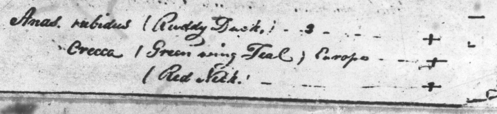 A mounted specimen of "Red Neck [Duck]" was listed, which may have been this species (APS Library, Mss.B.P31).