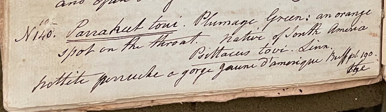 Charles Willson Peale (1741-1827) wrote, in his 16th Lecture (ca. 1799): "No. 140. Parrakeet tovi. Plumage green; an orange spot on the throat; native of South America. Psittacus tovi. Linn. Petite perruche a gorge jaune d'amerique Buff. pl. 190. The length is 6 ¾ inches." (Academy of Natural Sciences of Drexel University Archives, coll. 40)