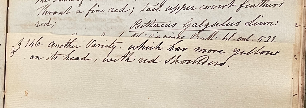 Charles Willson Peale (1741-1827) wrote, in his 16th Lecture (ca. 1799): "146. Another variety, which has more yellow on its head, with red shoulders." This comment was inserted as a footnote after his description of the "Botany Bay Little Lory." (Academy of Natural Sciences of Drexel University Archives, coll. 40)