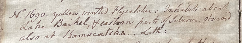Charles Willson Peale (1741-1827) wrote, in his 35th Lecture (ca. 1799): "No. 1690. Yellow vented Flycatcher. Inhabits about Lake Baikal, & eastern parts of Sibiria. Observed also at Kamscatska [sic]. Lath." (Academy of Natural Sciences of Drexel University Archives, coll. 40)