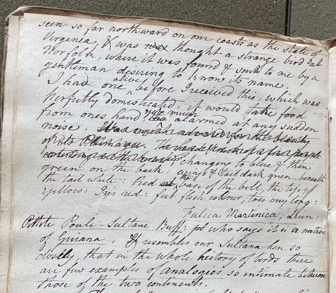 Charles Willson Peale (1741-1827) wrote, in his 27th Lecture (ca. 1799): "958. Purple Water-Hen. Thee birds are seldom seen so far northward on our coasts as the state of Virginia, & was thought a strange bird at Norfolk, where it was found & sent to me by a gentleman desiring to know its name. I had one alive before I received this, which was perfectly domesticated. It would take food from ones hand, yet much alarmed at any sudden noise." (Academy of Natural Sciences of Drexel University Archives, coll. 40)