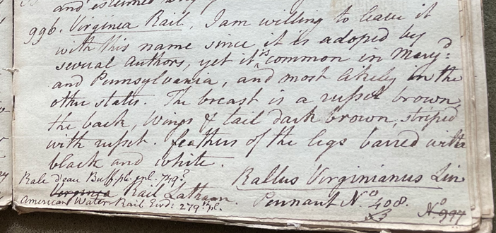Charles Willson Peale (1741-1827) wrote, in his 27th Lecture (ca. 1799): "996. Virginia Rail. I am willing to leave it with this name since it is adopted by several authors, yet it is common in Maryd and Pennsylvania, and most likely in the other states. The breast is a russet brown; the back, wings & tail dark brown, striped with russet; feathers of the legs barred with black and white. Rallus virginianus Linn. Rale d'eau Buff. pl. enl. 749? Rail Latham. Pennant No. 408. American Water-Rail Edw. 279. 997. Female, not quite so distinct & bright colour of plumage. They are found in marshes." (Academy of Natural Sciences of Drexel University Archives, coll. 40)
