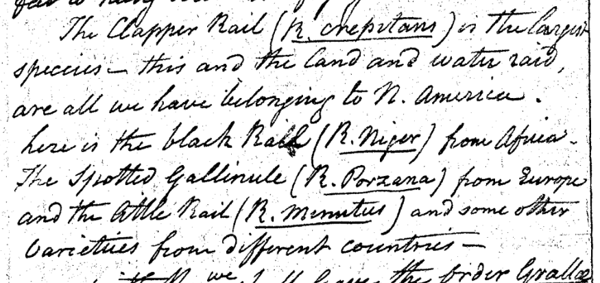 Charles Willson Peale (1741-1827) wrote, in "A Walk Through the Philad[elphi]a Museum" (1805–1806): "here is the black Rail (R. Niger) from Africa." (Historical Society of Pennsylvania, coll. 0481)