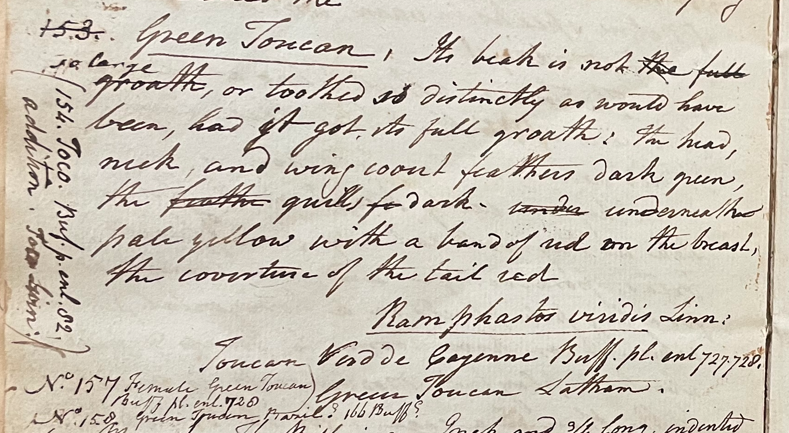 Charles Willson Peale (1741-1827) wrote, in his 16th Lecture (ca. 1799): "This before us, No. 153, is in very indifferent condition, it is a young Bird called the 153. Green Toucan. its beak is not the full groath, or toothed so distinctly as would have been, had it got its full groath; the head, neck, and wing covert feathers dark green, the feather quills dark. underneath pale yellow with a band of red on the breast, the coverts of the tail red. Ramphastos viridis Linn. Toucan Verd de Cayenne Buff. pl. enl. 727. 728. Green Toucan Latham. No. 157. Female Green Toucan. No. 158. Green Toucan Brazil? 166 Buffon?" (Academy of Natural Sciences of Drexel University Archives, coll. 40)