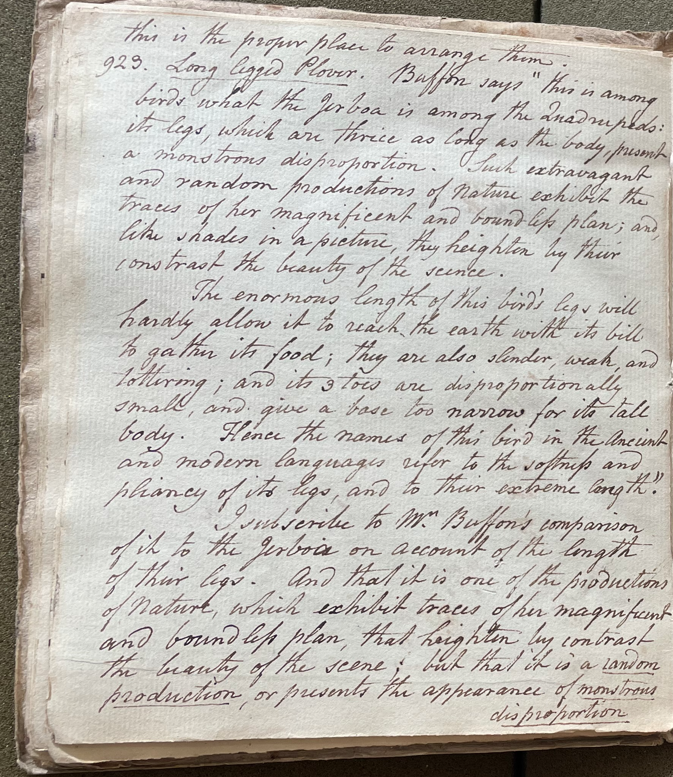 Peale wrote, in his 36th Lecture (ca. 1799): "923. Long legged Plover. Buffon says, "this is among birds what the Jerboa is among the Quadrupeds: its legs, which are thrice as long as the body, present a monstrous disproportion. Such extravagant and random productions of Nature exhibit the traces of her magnificent and boundless plan; and, like shades in a picture, they heighten by their contrast the beauty of the scene. The enormous length of this bird's legs will hardly allow it to reach the earth with its bill to gather its food; they are also slender, weak, and tottering; and its 3 toes are disproportionatelly small, and give a base too narrow for its tall body. Hence the names of this bird in the Ancient and modern languages refer to the softness and pliancy of its legs, and to their extreme length." (Academy of Natural Sciences of Drexel University Archives, coll. 40) Peale continued: "I subscribe to Mr. Buffon's comparison of it to the Jerboa on account of the length of their legs. And that it is one of the productions of Nature, which exhibit traces of her magnificent and boundless plan, that heighten by contrast the beauty of the scene; but that it is a random production, or presents the appearance of monstrous disproportion, is not concordant to the Ideas of Infinite Wisdom, excited by a survey of those works to which our capacities are adequate; whose fitness of parts and wonderful provision, flash the conviction of perfection on the most inattentive observer." (ANSP Archives, coll. 40) Peale continued: "Whether large, small, tall or slender; whether short or thick, with long or short legs, or no legs at all; whether crawling on the ground, flitting thro' the air, swimming in the waters or floating on the surface; whether their lives extend to a century, a year or half an hour; in all these varieties of Animals, by the little we are able to judge of their feelings, they are as perfect and as happy in their respective situations as Man. When we see Animals that live months without food, without requiring it; when we know that some can support life, for a great length of time even enclosed in glass or stone; when we consider that some are nourished by that which is poison to others; in fine the further we extend our observations, the more we must be convinced of the Folly to find fault with works which we want Wisdom to comprehend." (ANSP Archives, coll. 40)