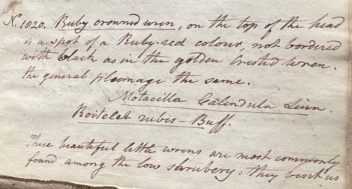 Charles Willson Peale (1741-1827) wrote, in his 36th Lecture (ca. 1799): "No. 1820. Ruby crowned wren. on the top of the head is a spot of a Ruby-red colour, not bordered with black as in the golden crested wren. The general plumage the same. Motacilla calendula Linn. Roitelet rubis Buff. These beautiful little wrens are most commonly found among the low shrubbery. They visit us in the spring & fall." (Academy of Natural Sciences of Drexel University Archives, coll. 40)