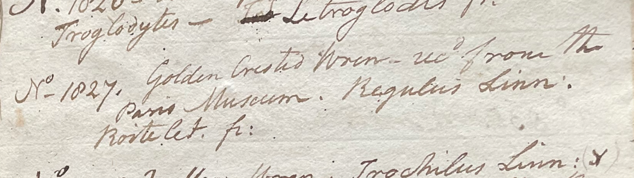 Charles Willson Peale (1741-1827) wrote, in his 36th Lecture (ca. 1799): "No. 1827. Golden Crested Wren recd from the Paris Museum. Regulus Linn. Roitelet fr." (Academy of Natural Sciences of Drexel University Archives, coll. 40)