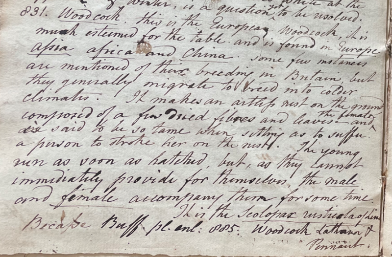 Charles Willson Peale (1741-1827) wrote, in his 26th Lecture (ca. 1799): "831. Woodcock. This is the European Woodcock; it is much esteemed for the table and is found in Europe, Assia, Africa and China. Some few instances are mentioned of their breeding in Britain, but they generally migrate to breed into colder climates. It mkes an artless nest on the ground, composed of a few dried fibres and leaves, and the female is said to be so tame when sitting as to suffer a person to strike her on the nest. The young run as soon as hatched, but, as they cannot immediately provide for themselves, the male and female accompany them for some time. It is the Scolopax rusticola of Linn. Becasse Buff. pl. enl. 885. Woodcock Latham & Pennant." (Academy of Natural Sciences of Drexel University Archives, coll. 40)