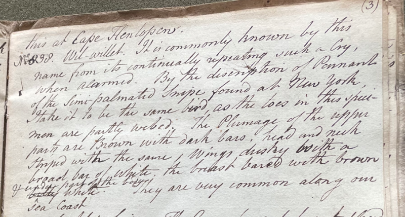 Peale wrote, in his 26th Lecture (ca. 1799): "838. Wil-willet. It is commonly known by this name from its continually repeating such a cry, when alarmed. By the description of Pennant of the Semi-palmated Snipe found at New York, I take it to be the same bird, as the toes in this specimen are partly webbed. The plumage of the upper parts are Brown with dark bars, head and neck striped with the same; wings dusky with a broad bar of white; the breast barred with brown & under part of the body white. They are very common along our sea coast … 847. Perhaps a female of the Wil Willet No. 838." (Academy of Natural Sciences of Drexel University Archives, coll. 40)