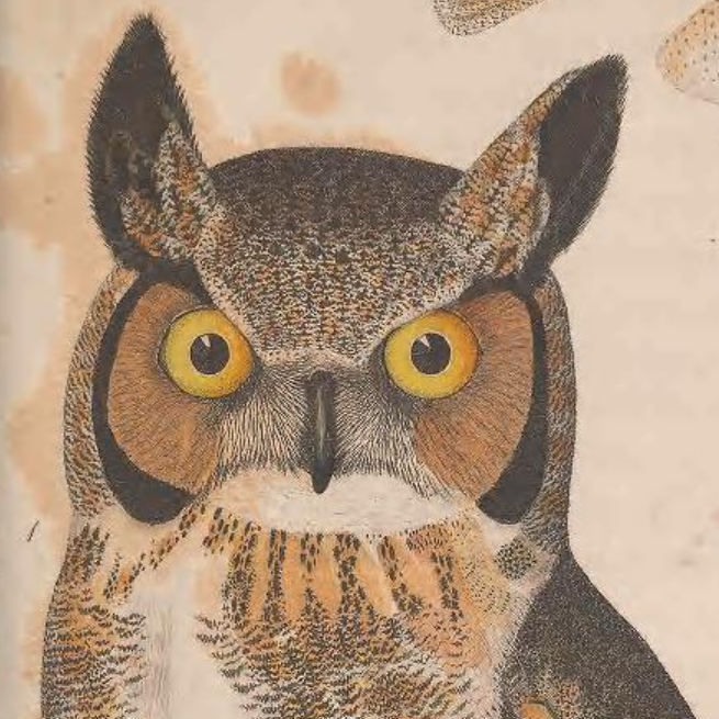 Charles Willson Peale (1741-1827) wrote, in his 14th Lecture (ca. 1799): "No. 55. Great horned Owl. Body variegated with brown, russet and black; large feathers in form of ears or horns; white spot under the neck and one below the breast; the toes of all the owls are so constructed that the two outer ones can be turned back like the toes of Parrots. Strix bubo. Linnaeus. There are varieties of the great […] this American owl differs from Buffon's le grand Duc p. 435. This has the black on the belly in bars, and in Buffon's they point downwards; the other differences may be too minute to be well ascertained without having both of them before us. Owls are not always silent. Their note to some is hideous. When persuing their prey it is seldom head, but may be considered rather as a call to courtship. It is seldom heard but in the silence of midnight, and breaks the general pause, with awful variation. These have a note very like the hoarse barking of a large Dog though not so loud, and afterwards a kind of screech; and to terrify their enemies they strike their bill together, best imitated by striking two stones together." (Academy of Natural Sciences of Drexel University Archives, coll. 40)