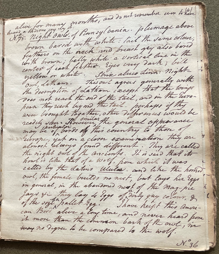 Charles Willson Peale (1741-1827) wrote, in his 14th Lecture (ca. 1799): "No. 75. Night Owl of Pennsylvania. plumage above brown barred with white; tail the same colour; feathers on the neck and breast grey, also barred with brown; belly white, [with] a vertical line in the center of each feather. Eyes very dark; bill yellow or white. Strix aluco Linn. Night Owl, Latham. This owl agrees generally with the description of Latham, except that the wings does not reach the end of the tail; and in the European they reach beyond the tail. Perhaps if they were brought together, other differences would be readily seen. However similar the general appearance may be of particular birds of this country to those of Europe, yet on a closer examination they are almost always found different." (Academy of Natural Sciences of Drexel University Archives, coll. 40)