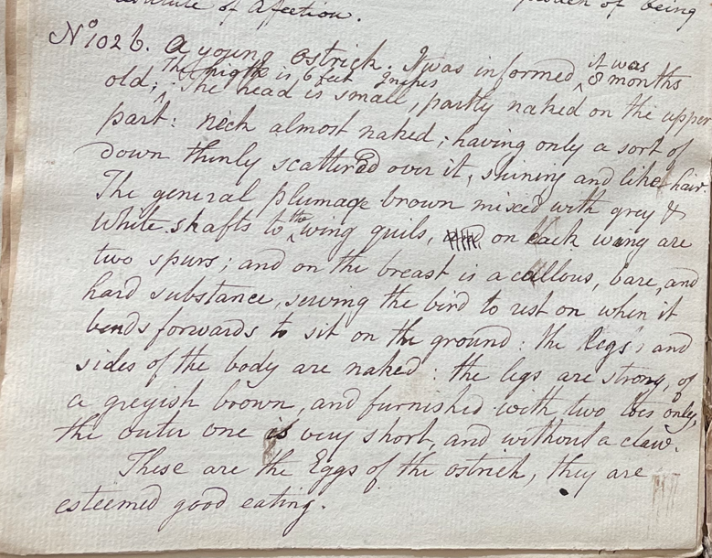 In his 27th Lecture, Peale wrote: "No. 1026. A young ostrich. I was informed it was 8 months old. The height is 6 feet [blank] Inches. The head is small, partly naked on the upper part; neck almost naked; having only a sort of down thinly scattered over it, shining and like hair. The general plumage brown mixed with grey & white shafts to the wing quils; on each wing are two spurs; and on the breast is a callous, bare, and hard substance, serving the bird to rest on when it bends forwards to sit on the ground; the legs, and sides of the body are naked; the legs are strong, of a greyish brown, and furnished with two toes only; the outer one is very short, and without a claw. These are the Eggs of the ostrich; they are esteemed good eating." (Academy of Natural Sciences of Drexel University Archives, coll. 40)