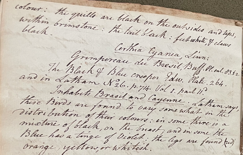 Charles Willson Peale (1741-1827) wrote, in his 20th Lecture (ca. 1799): "No. 400. Black and Blue Creeper. The length 4 ¼ Inches. Bill ¾ of an Inch in length, and Black; tongue the length of the bill, and ciliated, or divided into three at the end; the top of the head is beryl blue; the rest of the head, throat, fore part of the neck, brest, belly, sides, thighs, lower part of the back, upper tail and wing coverts, are of a fine violet Blue; on each side of the head is a black stripe, in which the eye is placed; the hind part of the neck, and upper part of the back, are velvet black; the upper wing and tail coverts are likewise black, but not so bright; the under wing coverts are brimstome colour; the quills are black on the outsides and tipes, within brimstone; the tail black; feet white, & claws black." (Academy of Natural Sciences of Drexel University Archives, coll. 40) Peale continued: "Certhia cyanea Linn. Grimpereau de Bresil, Buff. pl. enl. 83. t. 2. The Black & Blue creeper Edw. Plate 264. and in Latham No. 26. p. 714. Vol. I. Part IId. Inhabits Brasil and Cayenne. Latham says, these Birds are found to vary somewhat in the distribution of their colours; in some there is a mixture of black, on the breast; and in some, the Blue has a tinge of Violet; the legs are found red, orange, yellow, or whitish." (ANSP Archives, coll. 40)