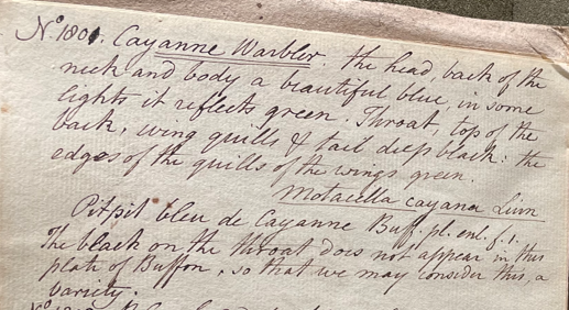 Peale also described the adult female, which he assumed was a different species: "No. 1802. Blue headed Warbler. head and upper wing coverts blue; throat blueish grey; the rest of the body, with the greater wing coverts, bright green; quills brown, edged with green. Motacilla cyancephala Linn. Pitpit vert. Buffon. Blue-headed Warbler Latham No. 139. Inhabits Cayenne." (ANSP Archives, coll. 40)