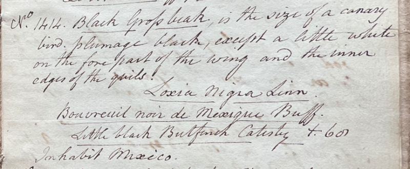 Charles Willson Peale (1741-1827) wrote, in his 32nd Lecture (ca. 1799): "No. 1414. Black Gross beak is the size of a canary bird; plumage black, except a little white on the fore part of the wing and the inner edges of the quils. Loxia nigra Linn. Bouvreuil noir de Mexique Buff. Little black Bullfinch Catesby t. 68. Inhabits Mexico." (Academy of Natural Sciences of Drexel University Archives, coll. 40)