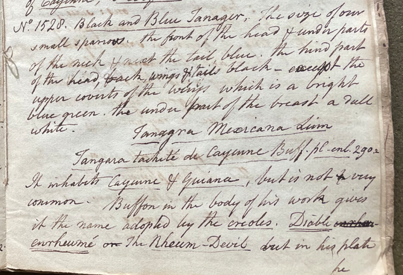 Charles Willson Peale (1741-1827) wrote, in his 33rd Lecture (ca. 1799): "No. 1528. Black and Blue Tanager. The size of our small sparrows. the front of the head & under parts of the neck & […] the tail blue. the hind part of the head, back, wings & tail black, except the upper coverts of the wings which is a bright blue green. the under part of the breast a dull white. Tanagra Mexicana Linn. Tangara tacheté de Cayenne Buff. pl. enl. 290.It inhabits Cayenne & Guiana, but is not very common. Buffon in the body of his work give it the name adopted by the creoles. Diable enrheumé, The Rheum-Devil, but in his plate he has thought proper to name it Spotted tangara. It is certainly a silly determination, for in the first place, it is not a Devil. 2dly. what colour is the Devil? And 3dly. what must his colour be, with a Cold? such vulgar sayings ought not to be noticed by an Author who describes and paints nature. The bare mention of it, excites ridicule." (Academy of Natural Sciences of Drexel University Archives, coll. 40)