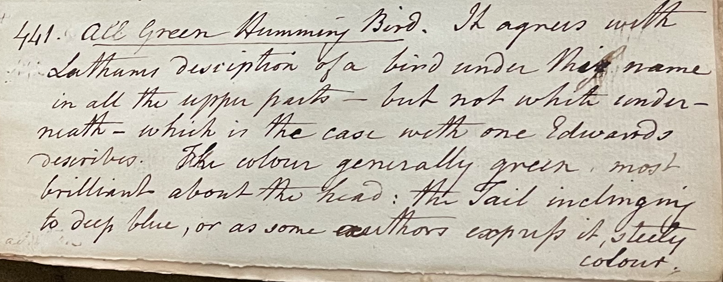 Charles Willson Peale (1741-1827) wrote, in his 20th Lecture (ca. 1799): "441. All Green Hummingbird. It agrees with Latham's description of a bird under this name in all the upper parts, but not white underneath, which is the case with one Edwards describes. The colour generally green, most brilliant about the head; the tail incining to deep blue, or as some authors express it, steely colour. I believe it is the Trochilus mellisugus Linn. … Buff. pl. enl. 276. f. 3. Though not correct, for this [has] not the light on the underparts like Buffon's plate." (Academy of Natural Sciences of Drexel University Archives, coll. 40)