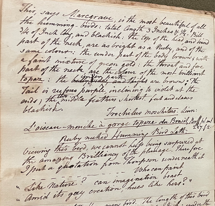 Peale wrote, in "A Walk Through the Philad[elphi]a Museum" (1805–1806): "The eye is caught by the Ruby Hummingbird (T. moschitus) we cannot help being surprised at the amazing brilliancy of its plumage. Therefore under-neath is a quotation from Thompson: '...who can paint like Nature? Can imagination boast amid its gay creation, hues like these'?" (Historical Society of Pennsylvania, coll. 0481)
