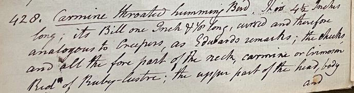 Charles Willson Peale (1741-1827) wrote, in his 20th Lecture (ca. 1799): "428. Carmine throated humming Bird. It is 4 ½ Inches long; its Bill one Inch & 1/8 long, curved and therefore analogous to Creepers, as Edwards remarks; the cheeks and all the fore part of the neck, carmine or crimson Red of Ruby-lustre; the upper part of the head, body and tail, of a soft blackish Brown, with a slight tinge of the blue on the edge of the feathers; a deep gold green shines on the wings; the inferior and superior coverts of the tail are of a fine blue. Trochilus jugularis Linn. The red-breasted Humming bird Edw. & Lath. Carmine-throated Colibri Buff. Inhabits Surinam." (Academy of Natural Sciences of Drexel University Archives, coll. 40)