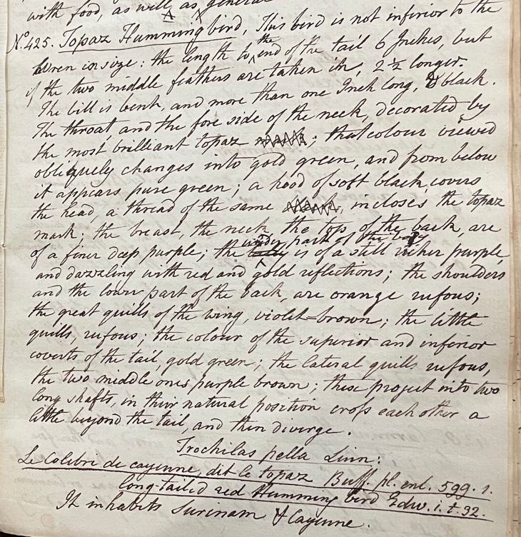 Charles Willson Peale (1741-1827) wrote, in his 20th Lecture (ca. 1799): "No. 425. Topaz Hummingbird. This bird is not inferior to the wren in size; the length to the end of the tail [is] 6 inches, but of the two middle feathers are taken in, 2 ½ [inches] longer. The bill is bent, and more than one inch long, & black. The throat, and the fore side of the neck, decorated by the most brilliant topaz; that colour viewed obliquely changes into gold green, and from below it appears pure green; a hood of soft black covers the heard, a thread of the same incloses [sic] the topaz mark; the breast, the neck, the top of the back, are of a finer deep purple; the upper part of the body is of a still richer purple, and dazzling with red and gold reflections; the shoulders and the lower part of the back, are orange rufous; the great quills of the wing, violet-brown; the little quills, rufous; the colour of the superior and inferior coverts of the tail, gold green; the lateral quill rufous, the two middle ones purple brown; these project into two long shafts, in their natural position cross each other a little beyond the tail, and then diverge." (Academy of Natural Sciences of Drexel University Archives, coll. 40)