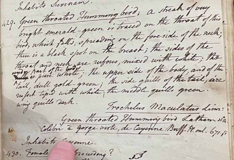 Charles Willson Peale (1741-1827) wrote, in his 20th Lecture (ca. 1799): "429. Green throated Humming Bird. A streak of bright emerald-greenis traced on the throat of this bird, which falls, spreading on the fore-side of the neck; there is a black spot on the breast; the sides of the throat and neck are rufous, mixed with white; the under part of the body is pure white; the upper side of the body, and of the tail, dull gold-green; the side quills of the tail are russet tipped with white; the middle quills green. Wing quills dark. Trochilus maculatus Linn. Green throated Humming bird Latham No. 14 Colibri a gorge verte, de Cayenne Buff. Pl. enl. 671. f1. Inhabits Cayenne. [No.] 430. Female of the preceding?" (Academy of Natural Sciences of Drexel University Archives, coll. 40)
