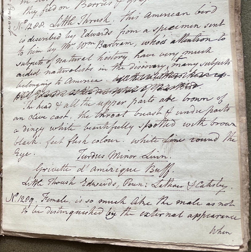 Charles Willson Peale (1741-1827) wrote, in his 31st Lecture (ca. 1799): "No. 1288. Little Thrush. this American bird is described by Edwards from a specimen sent to him by Mr. Wm. Bartram, who'es [sic] attention to subjects of natural history have very much aided naturalists in the discoverey of many subjects belonging to America. The Head & all the upper parts are brown of an olive cast, the throat breast & underparts a dingy white beautifully spotted with brown black. Feet flesh colour. White line round the eye. Turdus minor Linn. Grivette d'Amerique Buff. Little Thrush Edwards, Penn; Latham & Catesby. No. 1289. Female, is so much like the male as not to be distinguished by the external appearance, when preserving I have recourse to desection, which enables me to rectify the errors of several authors, who have wrote on the American birds. They are generally found in the retired places of our woods, and very often on the ground. common throughout the United States. No. 1290. A Variety of the same, the only difference, these are smaller. No. 1291. Female." (Academy of Natural Sciences of Drexel University Archives, coll. 40)