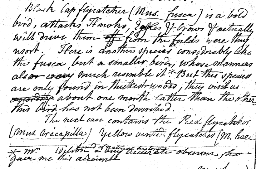 Charles Willson Peale (1741-1827) wrote, in "A Walk Through the Philad[elphi]a Museum" (1805-1806), after his account of "Black Cap flycatcher (Mus. fusca)" (=Eastern Phoebe, Sayornis phoebe): "Here is another species considerably like the fusca, but a smaller bird, whose manners also very much resemble it. Mr. Wilson [fond] of Natural History & a very accurate observer, gave me this account. But this species are only found in thickest woods, they visit us about one month latter than the other, this bird has not been described." (Historical Society of Pennsylvania, coll. 0481)