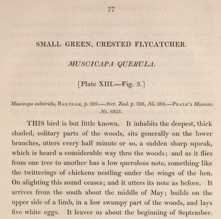 Alexander Wilson (1766-1813) described this species under the name "Small green, crested flycatcher / Muscicapa querula" in American Ornithology vol. 2 (Pl. 13), where "Peale's Museum No. 6825" was cited (Wilson 1810: 77).