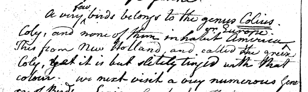 Charles Willson Peale (1741-1827) wrote, in "A Walk Through the Philad[elphi]a Museum" (1805–1806): "This from New Holland, and called the green Coly, yet it is but slitely tinged with that colour." (Historical Society of Pennsylvania, coll. 0481)