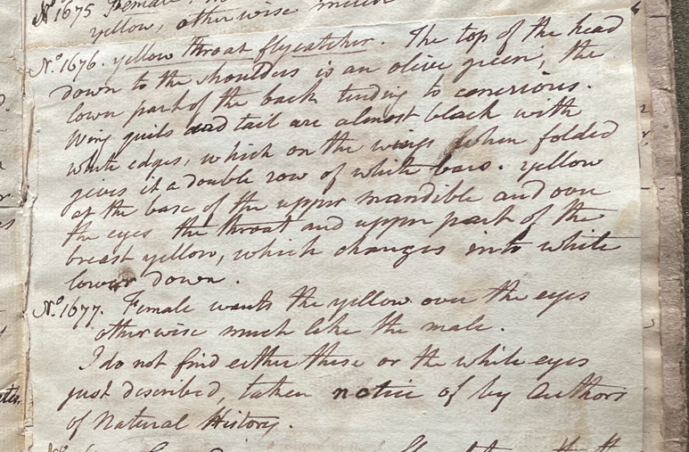 Charles Willson Peale (1741-1827) wrote, in his 35th Lecture (ca. 1799): "No. 1676. Yellow Throat Flycatcher. The top of the head down to the shoulders is an olive green; the lower part of the back tending to cenerious. Wing quills and tail are almost black with white edges, which on the wings when folded gives it a double row of white bars. yellow on the base of the upper mandible and over the eyes. The throat and upper part of the breast yellow, which changes into white lower down. No. 1677. Female wants the yellow over the eyes, otherwise much like the male. I do not find either these or the white eyes just described [White-eyed Vireo, Vireo griseus] taken notice of by Authors of Natural History." (Academy of Natural Sciences of Drexel University Archives, coll. 40)
