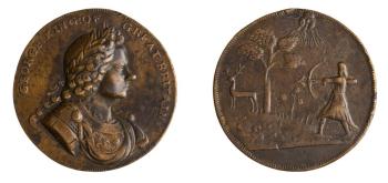 A copper medal of the size of a Dollar, the bust of the king on one side and round it George, king of great britain