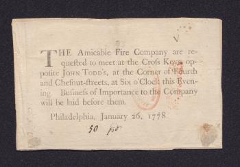 Amicable Fire Company (Philadelphia) notice of a meeting, 1778