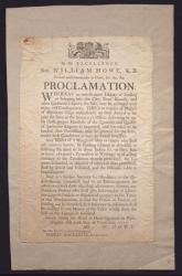 British proclamation requiring merchants to obtain written permission to unload imported liquors, and offering a reward to anyone providing information leading to the detection of violators, 1777