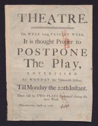 Southwark Theatre (Philadelphia) notice that performaces will be posponed due to Passion Week, 1779