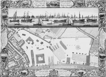 Trans.: The plans and elevations in perspective of the shipyards and ports for his Britannic Majesty's warships