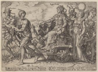 A gothic print representing Riches drawn in a car by Danger & fear &c.
