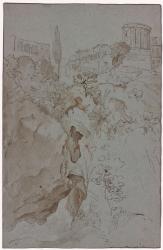 Trans.: A drawing of the waterfalls at Tivoli by Francisque Bolognese in brown wash