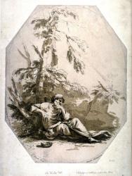 Estampe d'aprés desseins de Salvator Rosa lavé de brun en clair obsc[ure] [chiaroscuro] un figure au pied d'un arbre