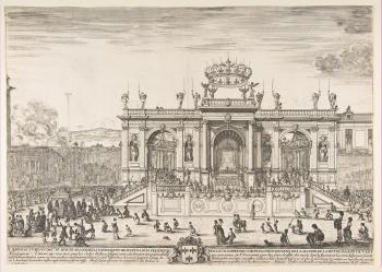 Trans.: A print by della Bella of marching troops, cannons, and attacks on places