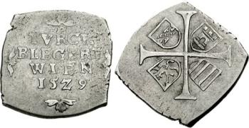 Trans.: Square silver coin of Vienna when besieged by the Turks in 1529