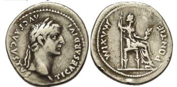 [Roman coin:] [Obverse:] Tib. Cæsar. Divi. aug. f. augustus; [Reverse:] Pontif. maxim. fig. mul. Sed. d. hastam. S. ramum