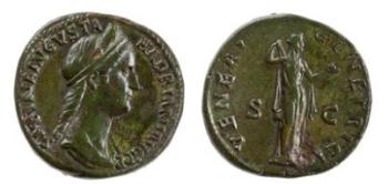 [Roman coin:] [Obverse:] Antoninus aug.; [Reverse:] mulier Stans. SC